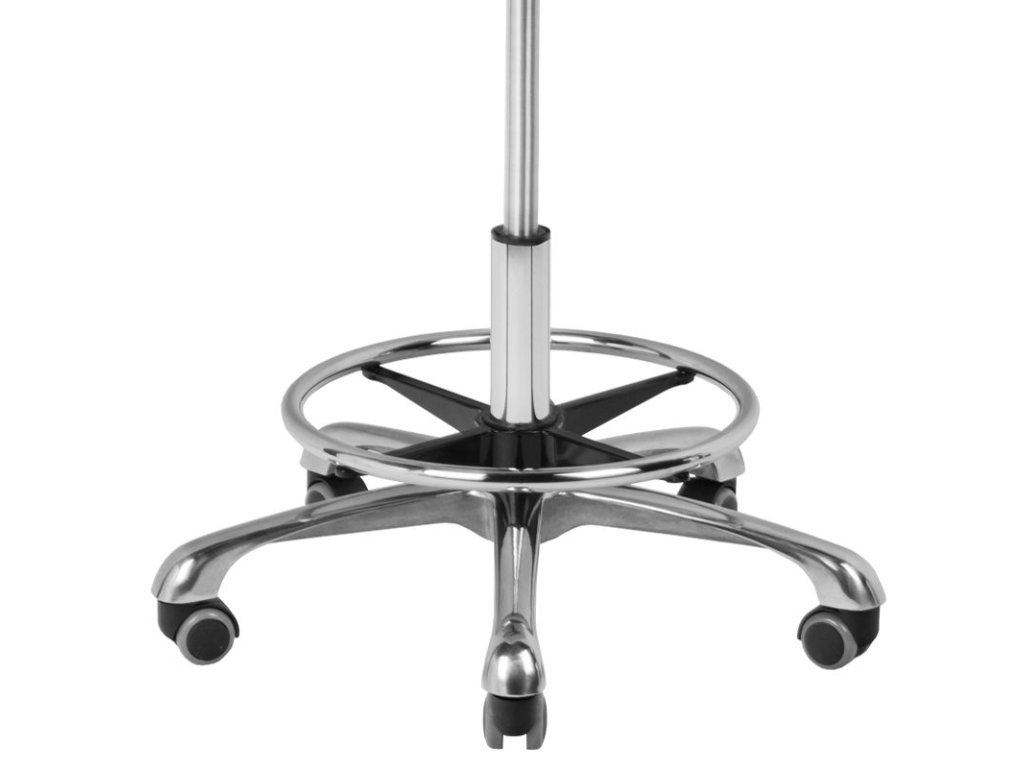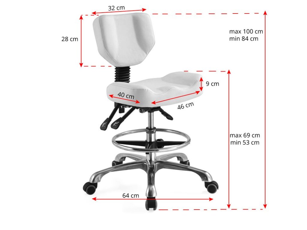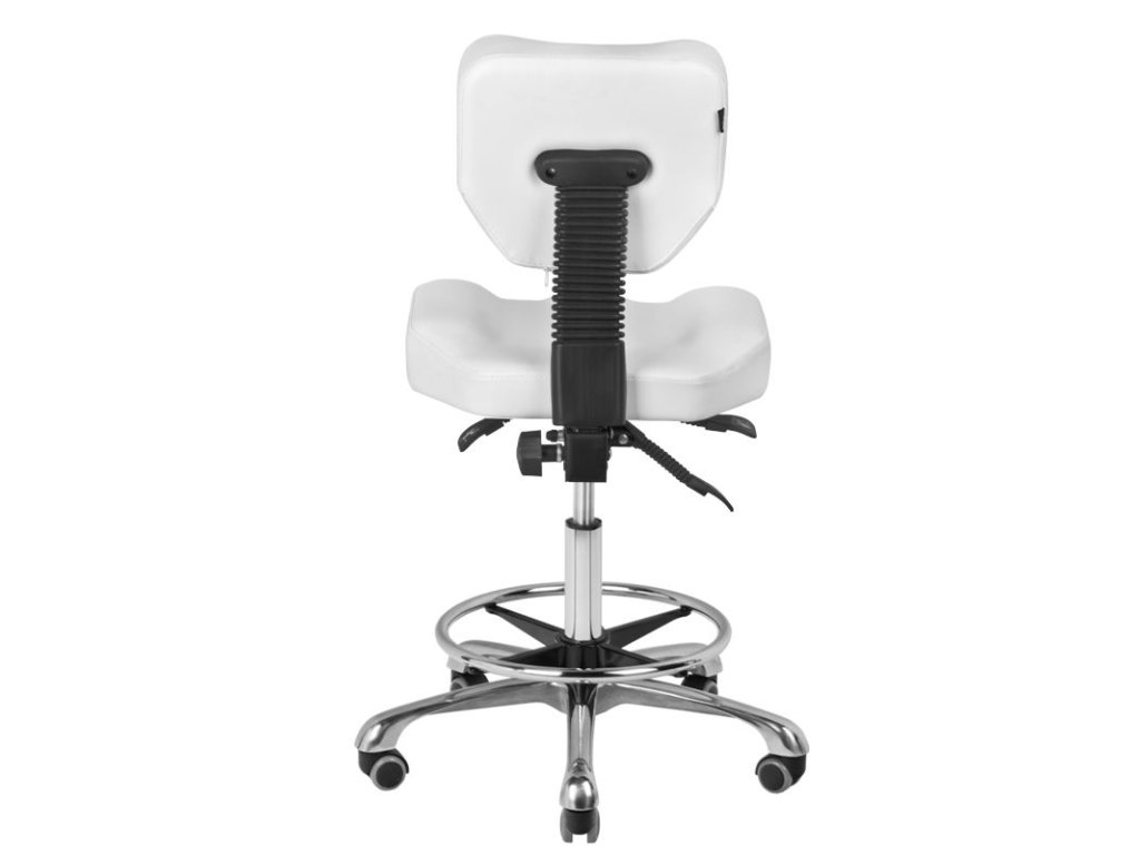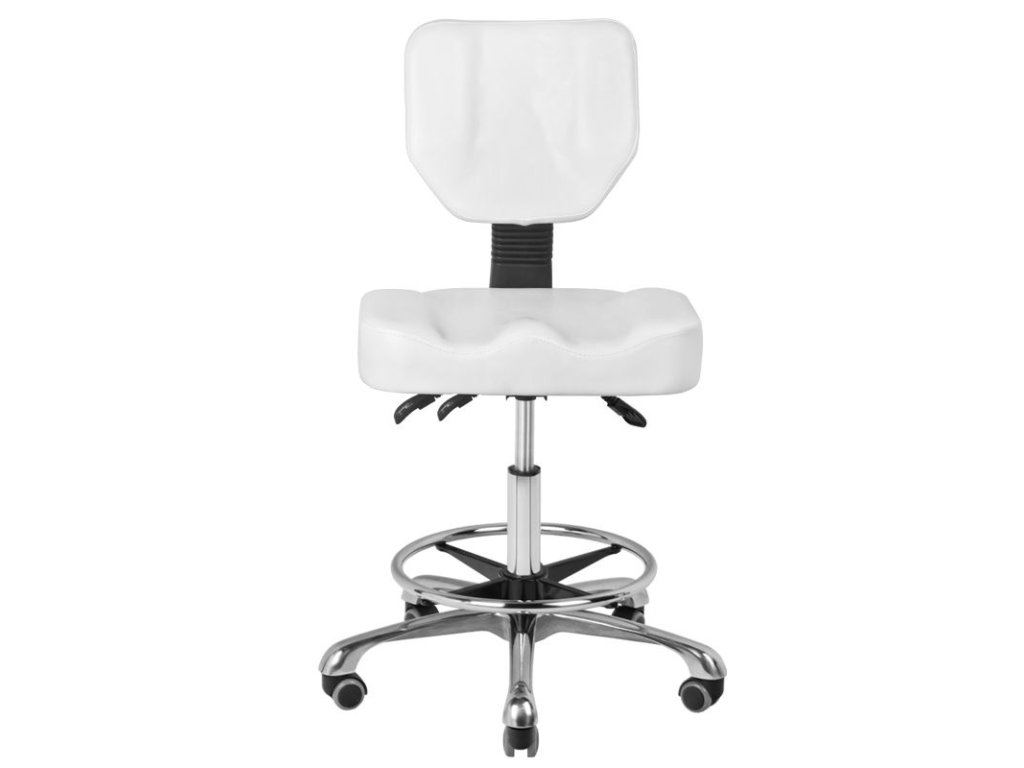 Nejnovější model kosmetického taburetu. Neuvěřitelně pohodlné. Regulace ve třech rovinách umožňuje dokonale optimalizovat polohu židle. Kromě vertikálního nastavení můžeme nastavit úhel opěradla a sklon sedadla. Perfektní pro dlouhé hodiny práce. Obruč na podporu nohou nad stupačkami. Barva čalounění sedadla je bílá.