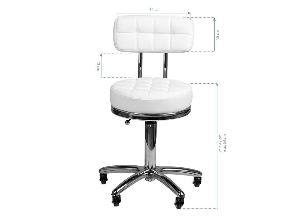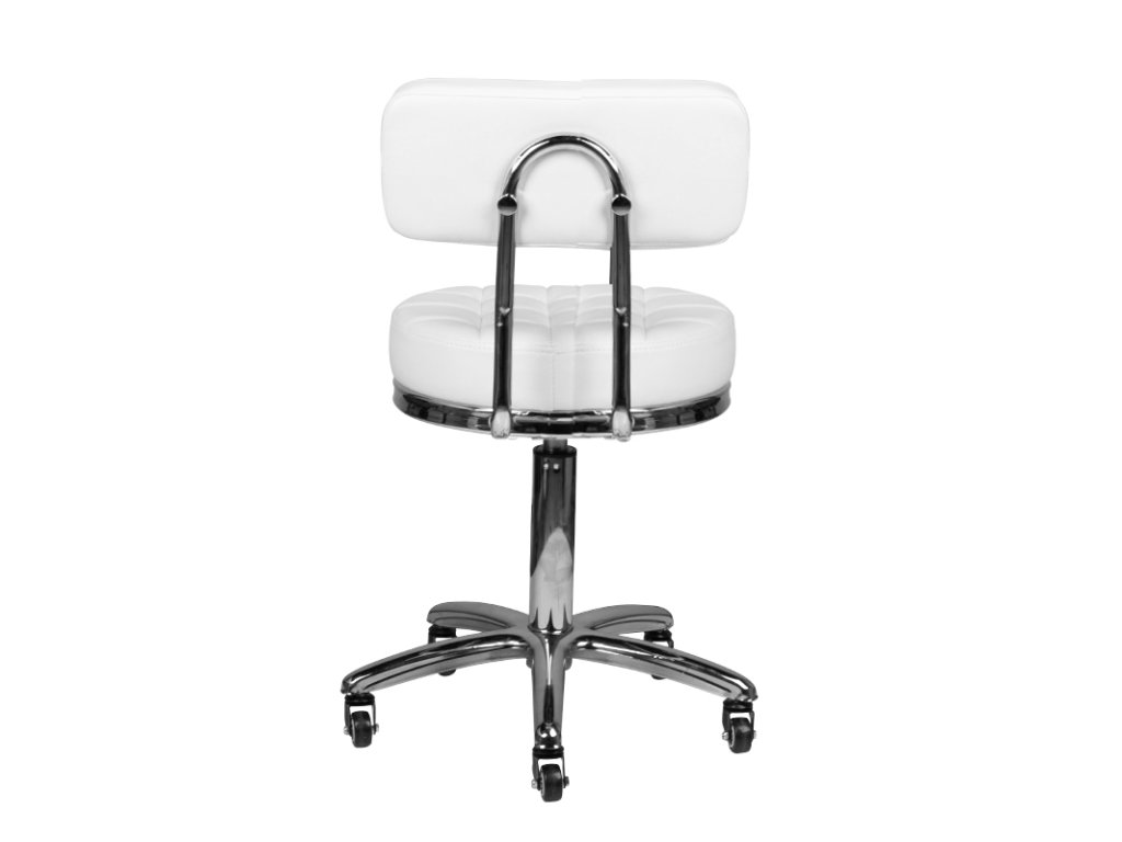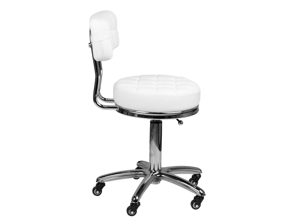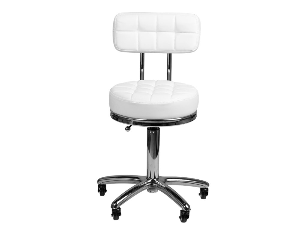 Bílý kosmetický taburet s prošívaným sedákem a pohodlným opěradlem. Je výškově nastavitelný a základna ve tvaru paže je vybavena pevnými kolečky z kovové gumy.