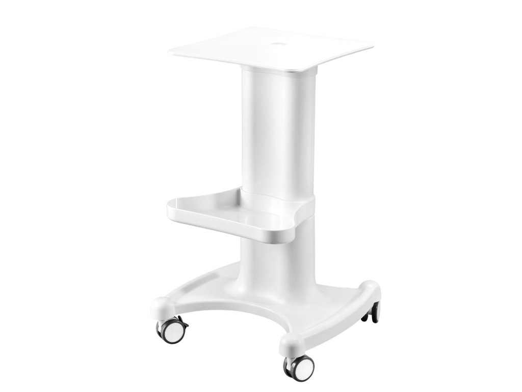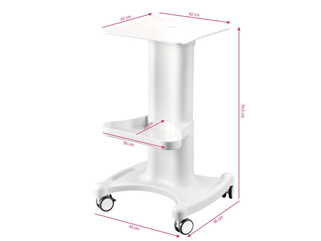 Funkční plastový vozík s gumovými kolečky s funkcí zámku. Perfektní jako stůl pro kosmetické zařízení. Má dvě police, jednu pro zařízení a druhou pro příslušenství. Nábytek poskytuje pohodlí a pohodlí při práci.