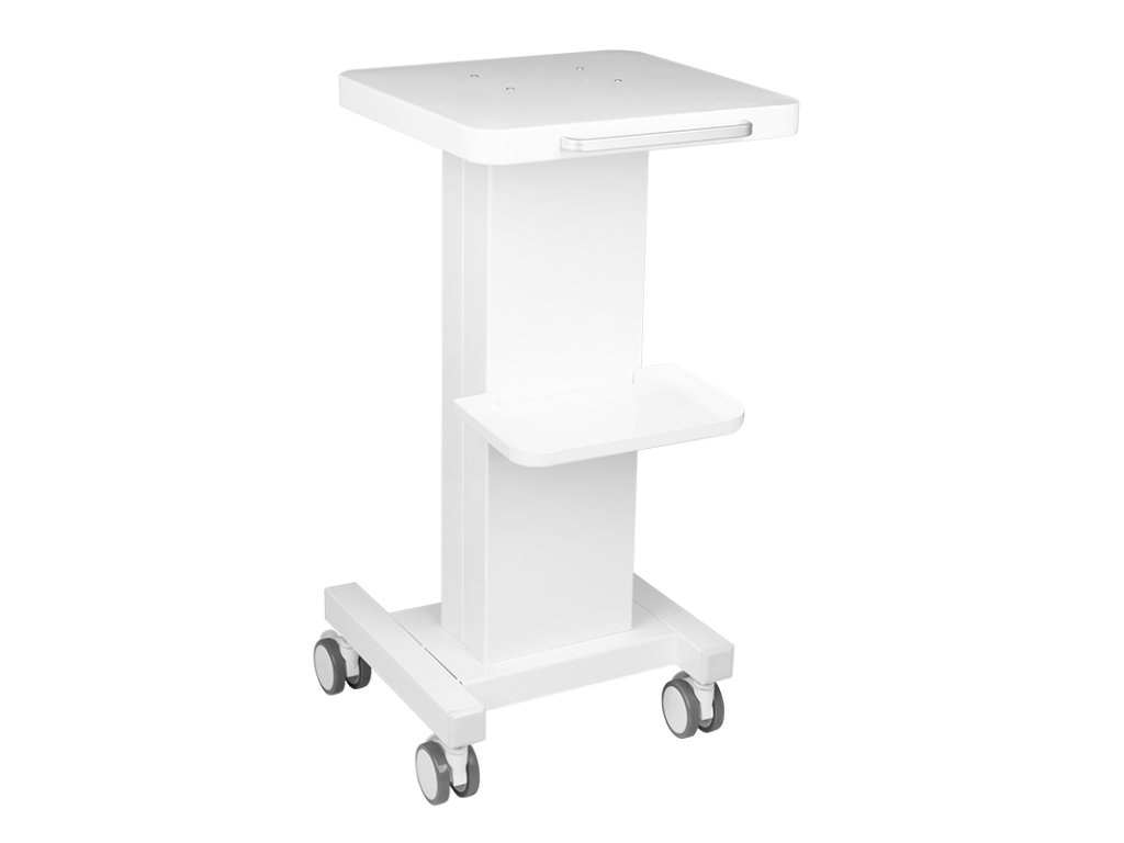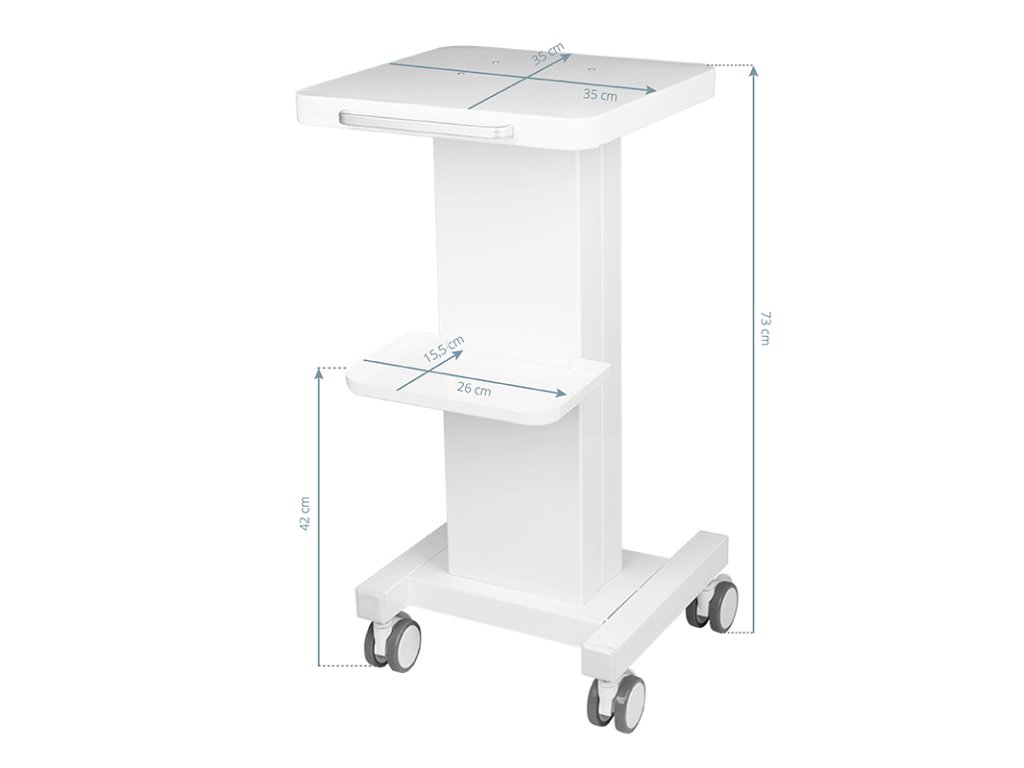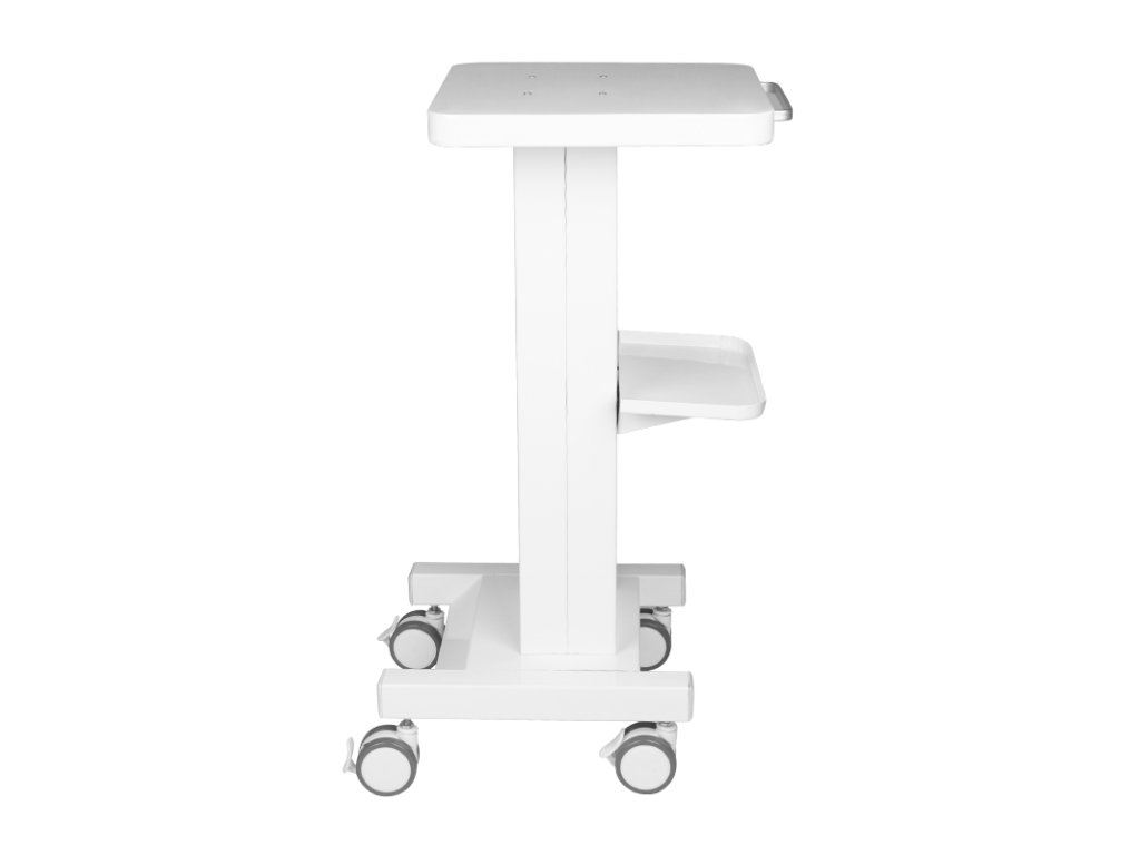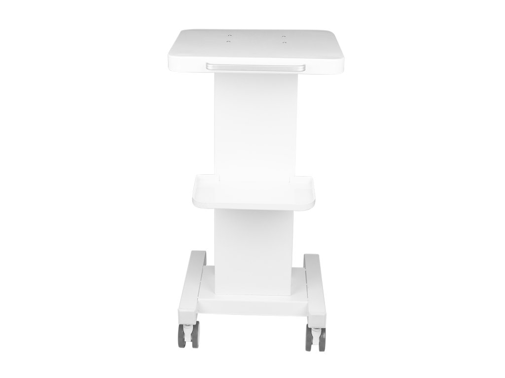 Funkční kovový vozík s gumovými kolečky s funkcí zámku. Perfektní jako stůl pro kosmetické zařízení. Má stabilní polici pro zařízení a další polici pro příslušenství a díky kolečku je vozík mobilní a snadno se pohybuje. Nábytek poskytuje pohodlí a pohodlí při práci