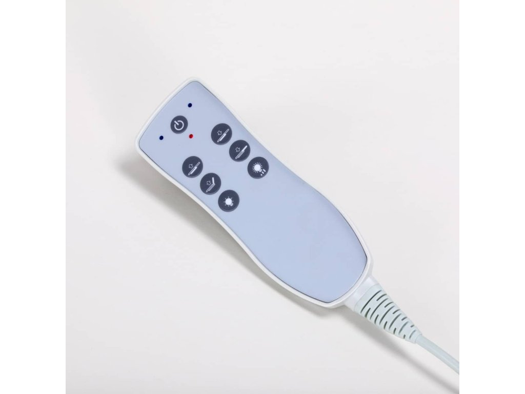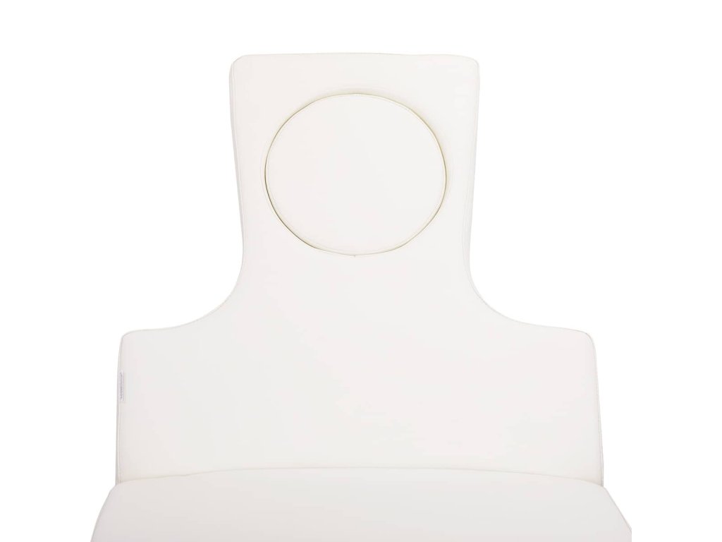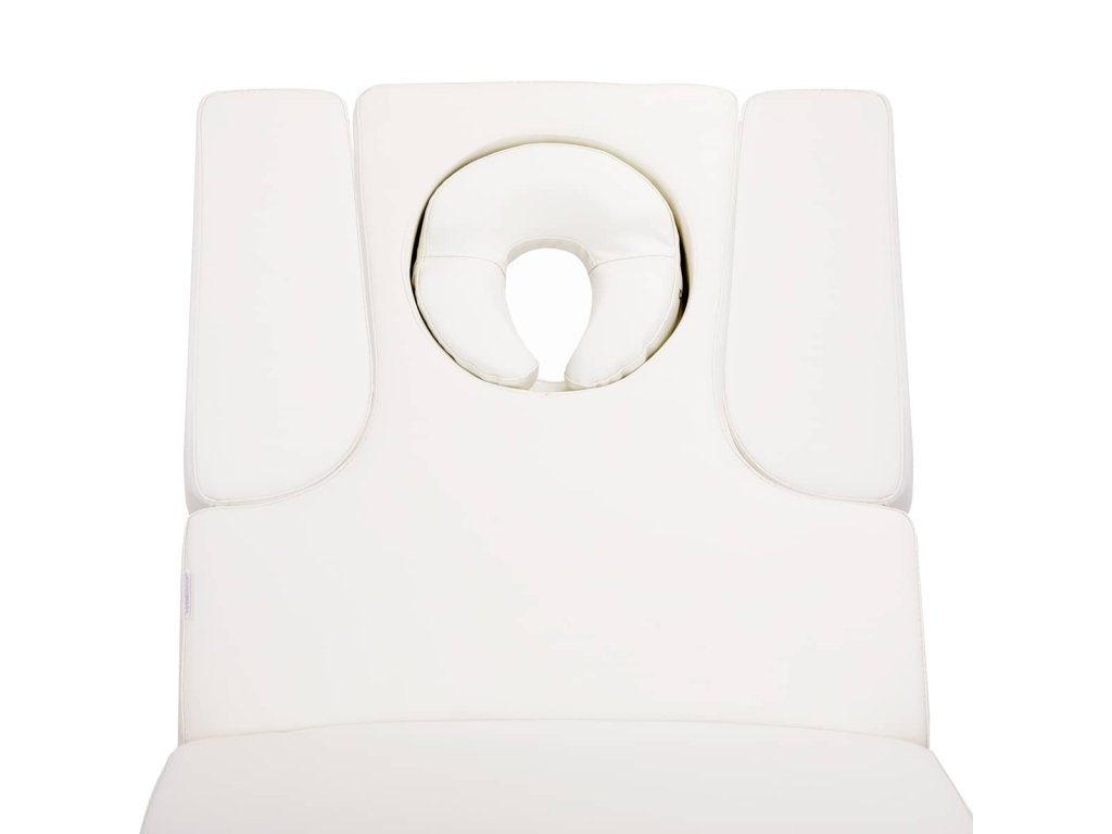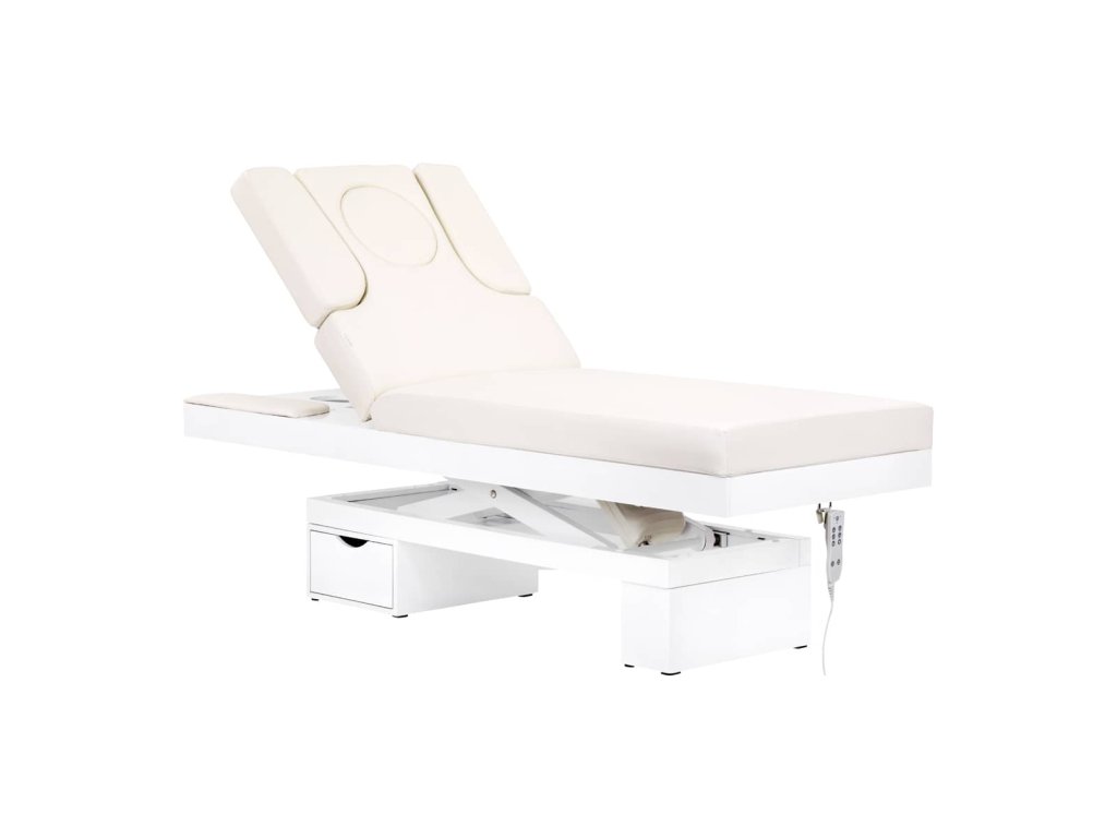 Elektrické nastavení výšky ve velmi širokém rozsahu - od 58 do 85 cm. Opěradlo je také nastavitelné pomocí dálkového ovládání, z vodorovné do téměř svislé polohy (stoupá na 80 stupňů). V základně je otvor se dvěma různými vložkami - jednou, zcela vyplňující a druhou s otvorem pro obličej. Možnost vysunutí do strany nebo úplné rozebrání bočních částí opěradla. Ve spodní části pod opěradlem je zásuvka pro praktické příslušenství. Široký (76 cm) kus nábytku se silnou a velmi pohodlnou matrací. Lehátko je velmi stabilní. Je čalouněný kvalitní ekokůže v jemném odstínu ecru. Kus nábytku v krásné barvě wenge.