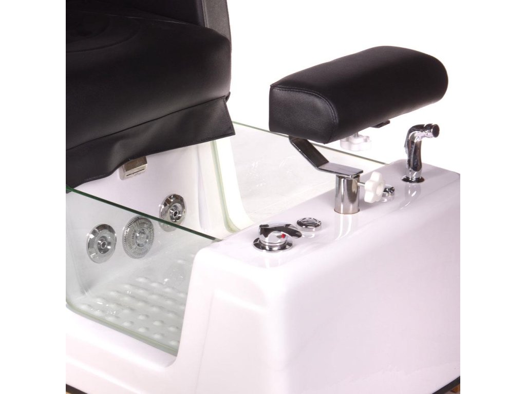 Poloha sedadla elektricky nastavitelná dálkovým ovládáním (přední/zadní část a opěradlo) Sedadlo vybavené válečkem a tlakovým masážním systémem Polštáře z kvalitní elastické pěny Čalounění z kvalitní ekologické kůže, snadno udržovatelné v čistotě. Vertikálně nastavitelná opěrka nohou. Podstavec z vysoce kvalitního akrylu. Možnost připojení tekoucí vody a kanalizace. Vana má funkci hydromasáže a barevné terapie. Vana je vybavena baterií pro regulaci teploty vody a sprchovou rukojetí. Přívodní a odtokové přípojky jsou umístěny v zadní části sedátka vany. Lze je také instalovat pod vanu. odtok o průměru 6 cm, ve výšce 4 cm od země, přívod teplé a studené vody - průměr 2 cm, ve výšce 4 cm od země.