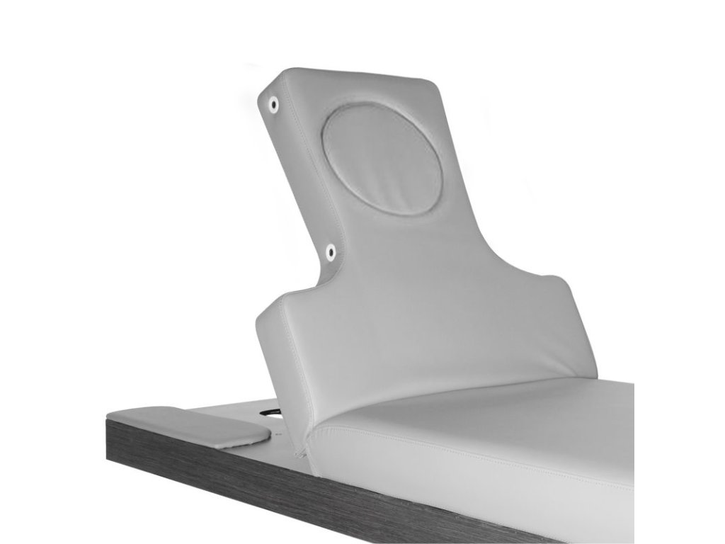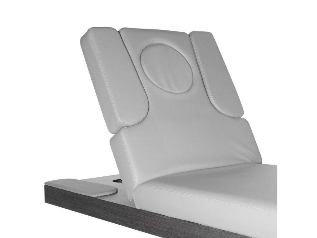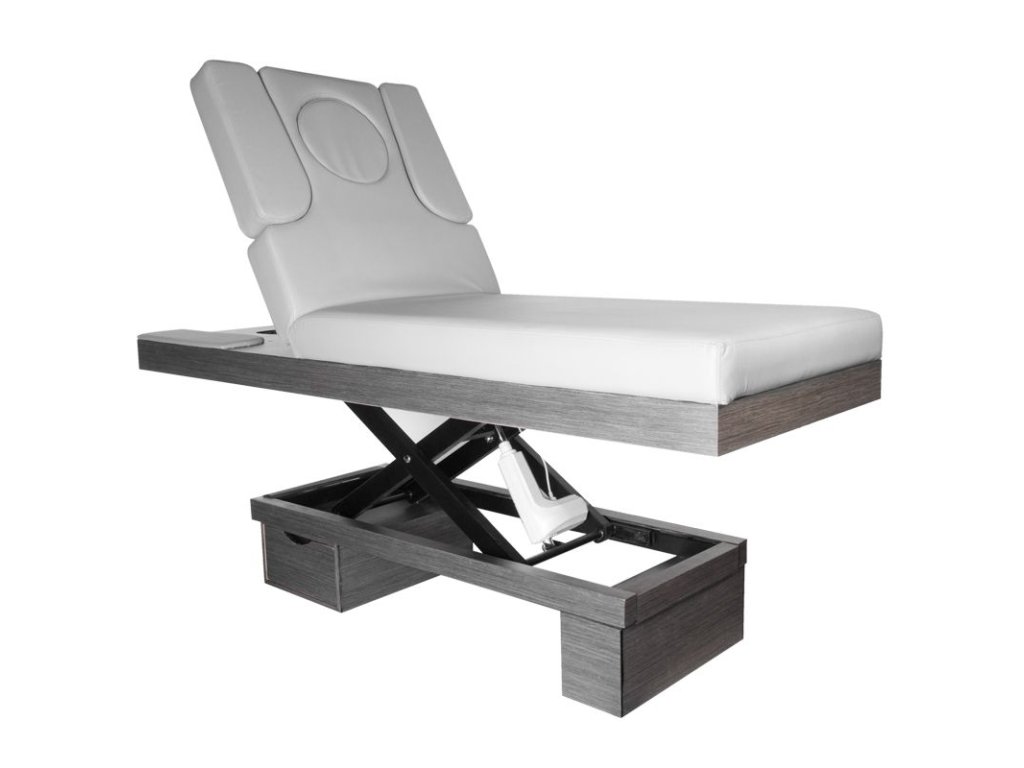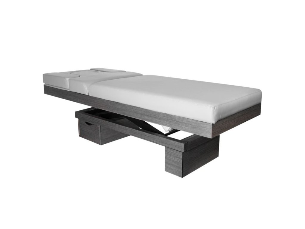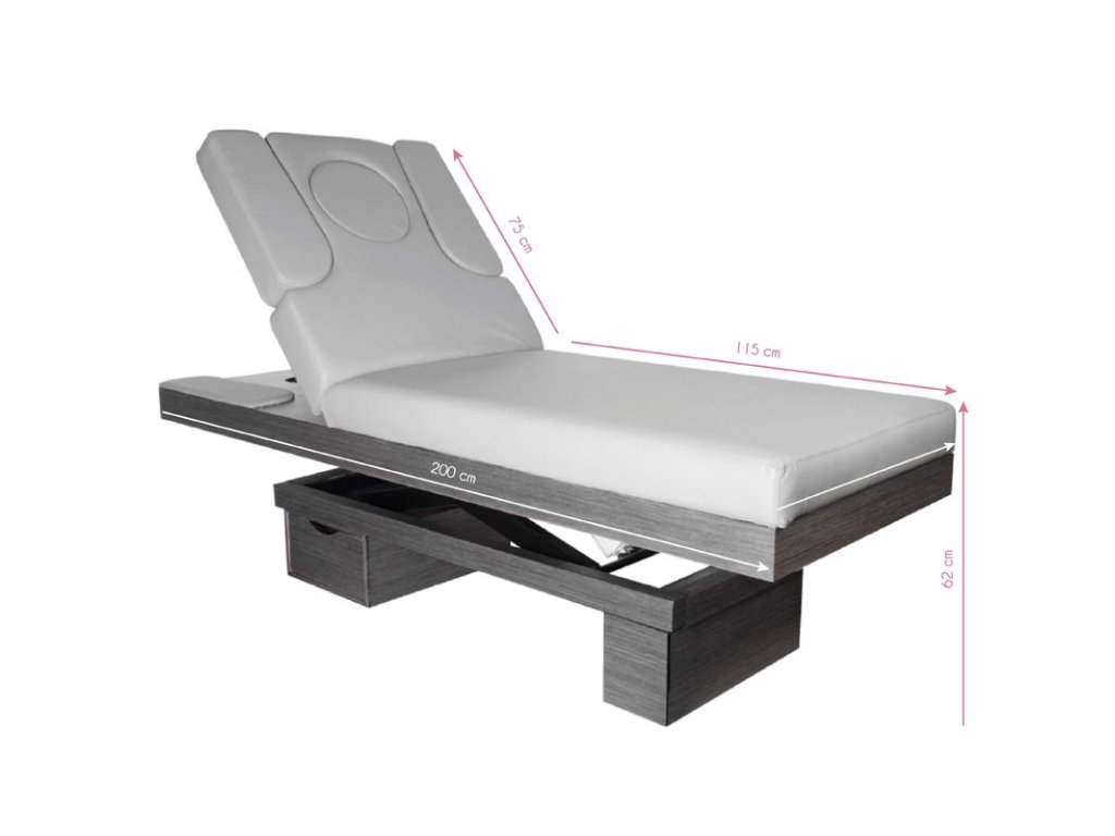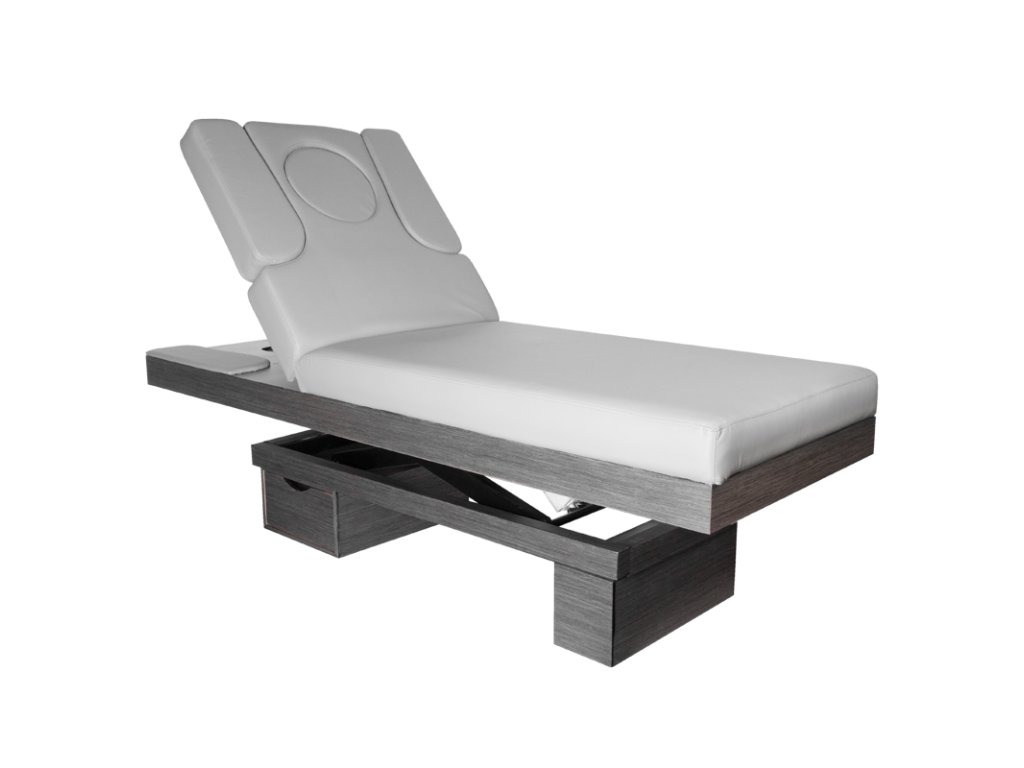 Elektrické nastavení výšky ve velmi širokém rozsahu - od 58 do 85 cm. Opěradlo je také nastavitelné pomocí dálkového ovladače, od vodorovného po téměř svislé (stoupá až o 80 stupňů). Na základě otvoru se dvěma vyměnitelnými vložkami - jednou, zcela vyplňující a druhou s otvorem pro obličej. Možnost bočního prodloužení nebo úplné demontáže bočních částí opěradla. Ve spodní části pod opěradlem je zásuvka pro praktické příslušenství. Široký (76 cm) kus nábytku se silnou, vyhřívanou a velmi pohodlnou matrací. Lehátko je velmi stabilní. Je čalouněný vysoce kvalitní ekokůže.