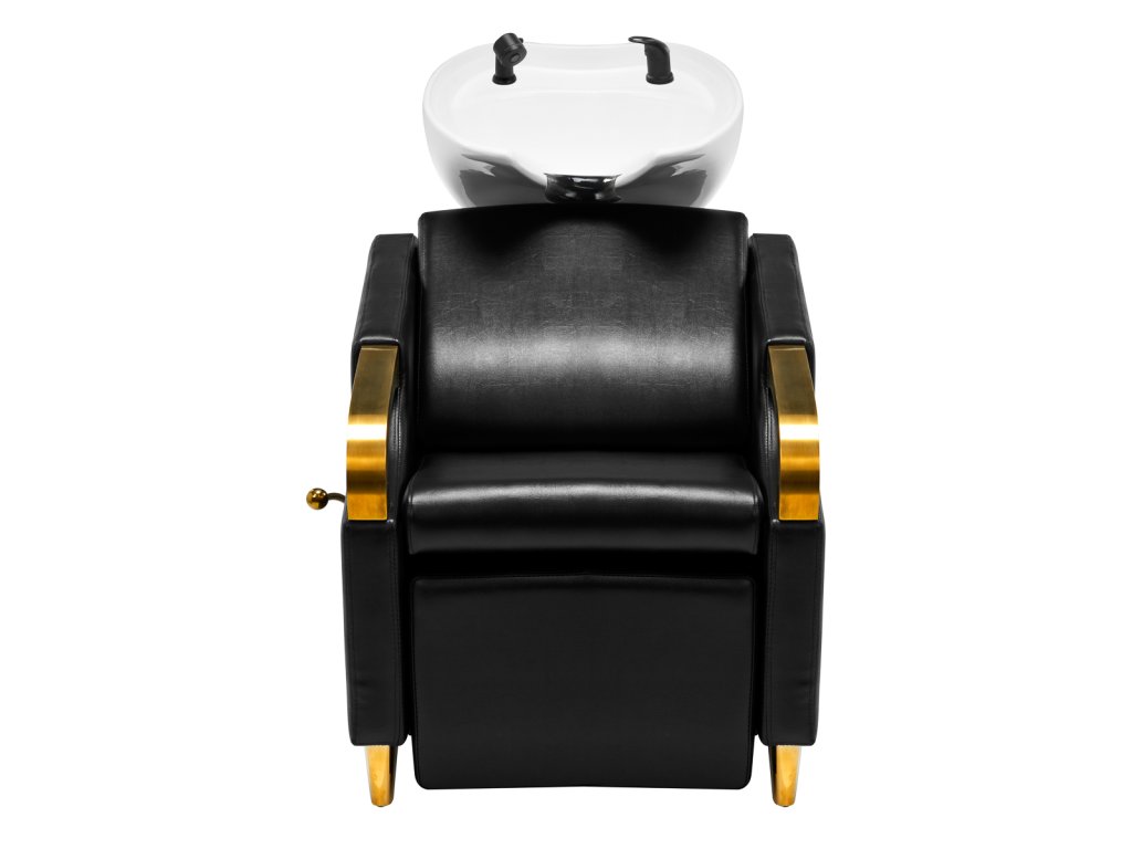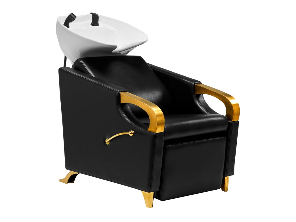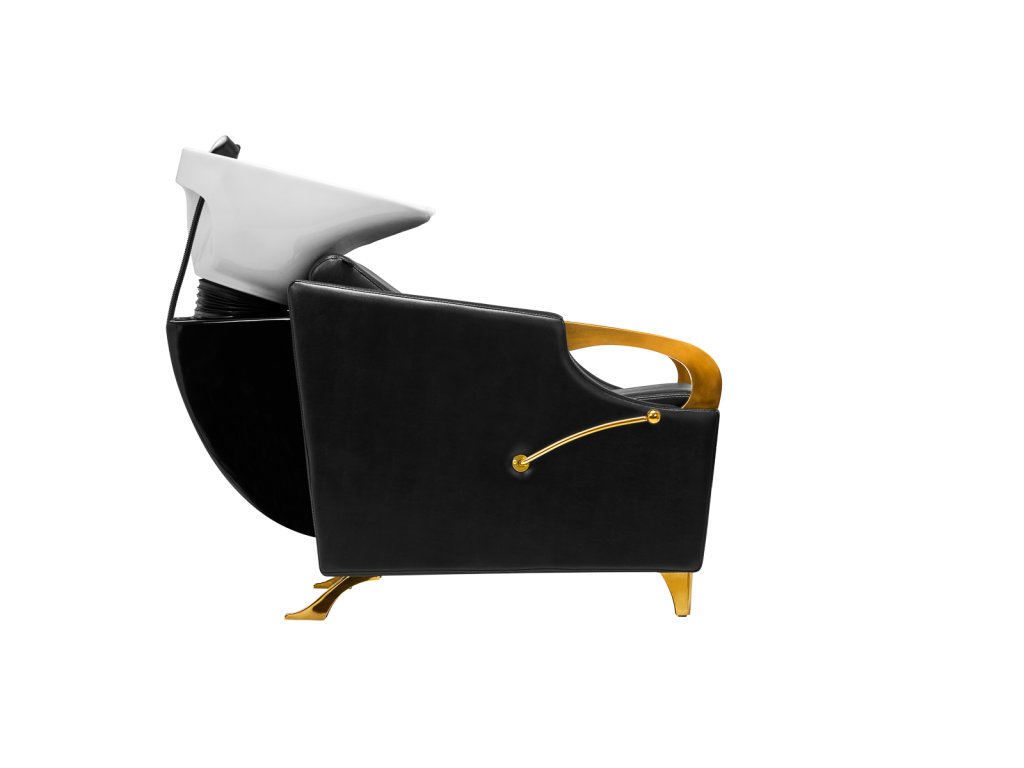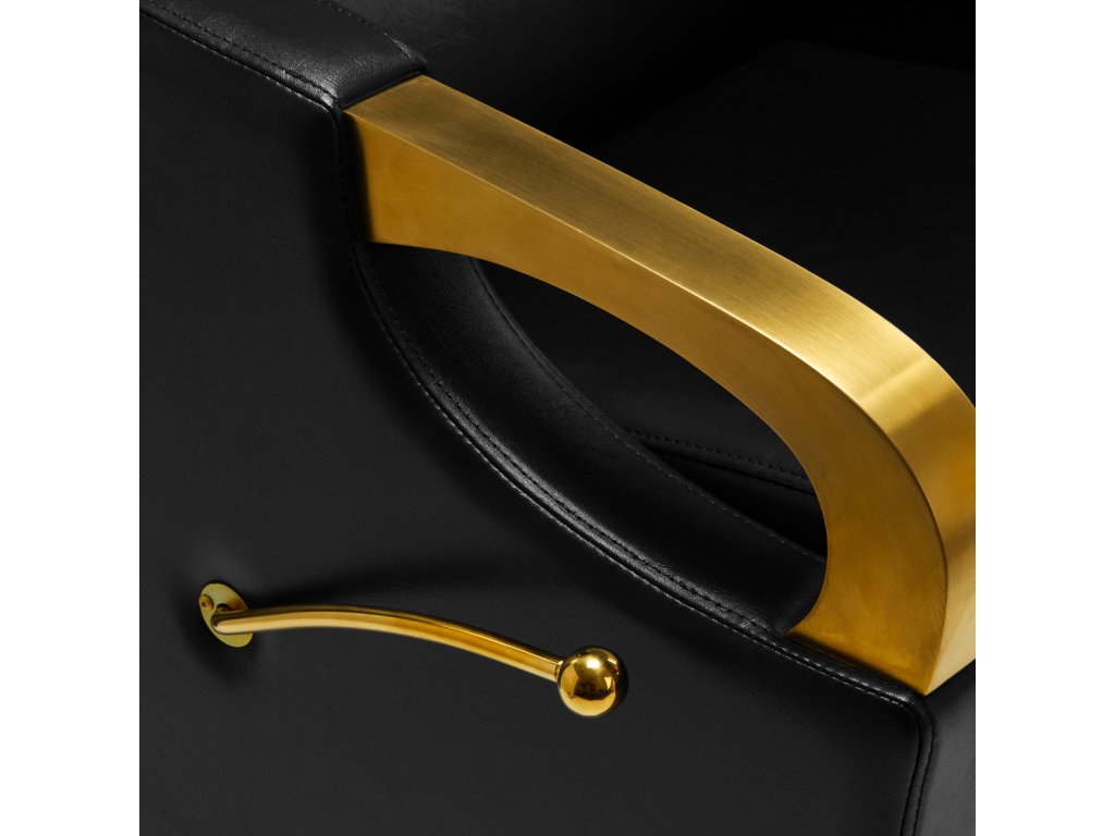 Tvarované křeslo vyplněné odolnou pěnou poskytuje přiměřenou bederní oporu a tím i vysoký komfort používání. Područky s prvky ve zlatých odstínech umožňují správné umístění ramen zákazníka . Potah ze syntetické kůže příjemný na dotek v odstínech černé zajišťuje dlouhodobou odolnost a snadné čištění . Elegantní vzhled mycího boxu dodává interiéru jedinečný výraz. Nohy a páka ve zlatých odstínech dodávají stabilitu a jemně zdůrazňují stylový charakter boxu. Sada obsahuje kompletní armatury v odstínech černé, včetně baterie, sprchové hlavice a vyhrazených hadic, které poskytují kompletní sadu nářadí pro práci.