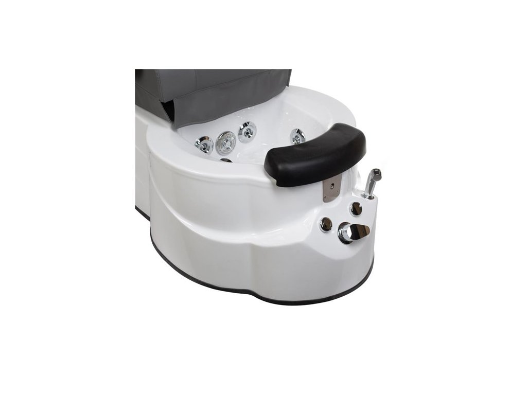 Součástí křesla je akrylátová vana s hydromasážní funkcí a colorterapií, vybavená baterií s regulací teploty vody a sprchovou hlavicí. Díky tomu získají klienti nejen precizní péči, ale také dokonalý relaxační zážitek. Vertikálně nastavitelná opěrka nohou umožňuje pohodlnou polohu pro každého zákazníka.