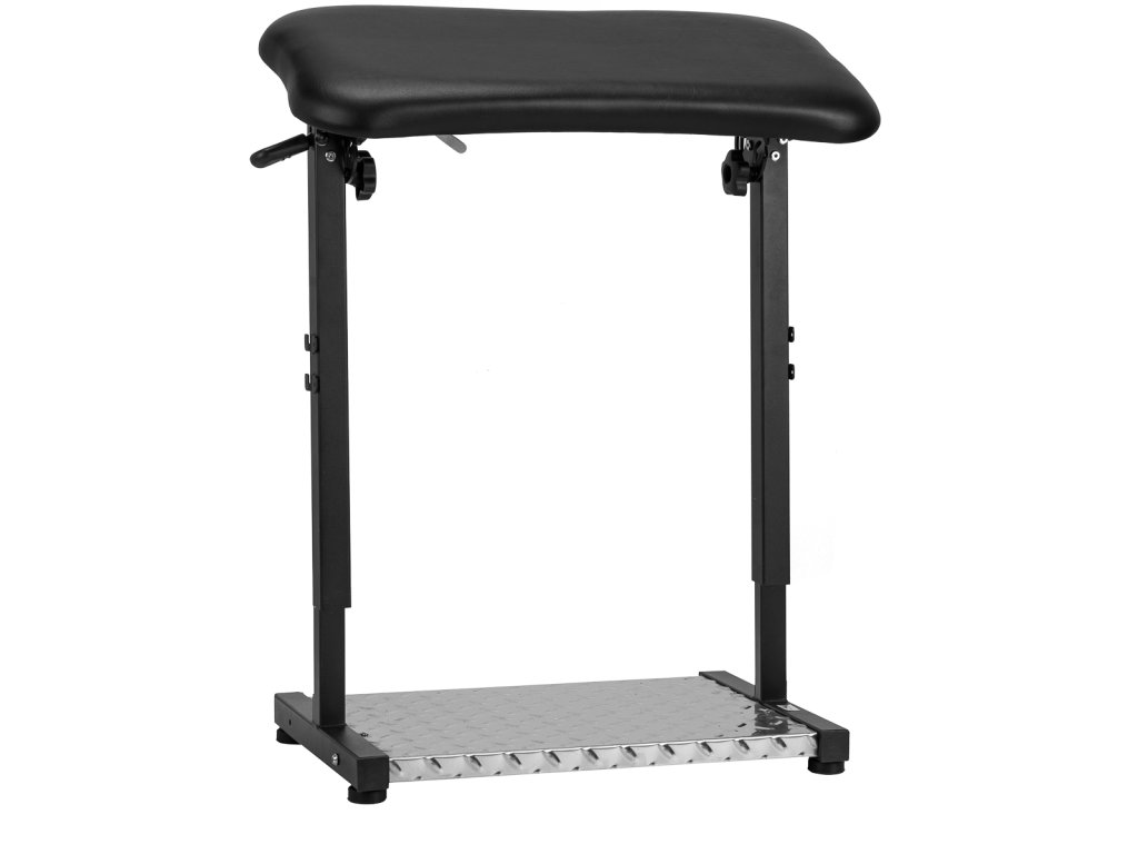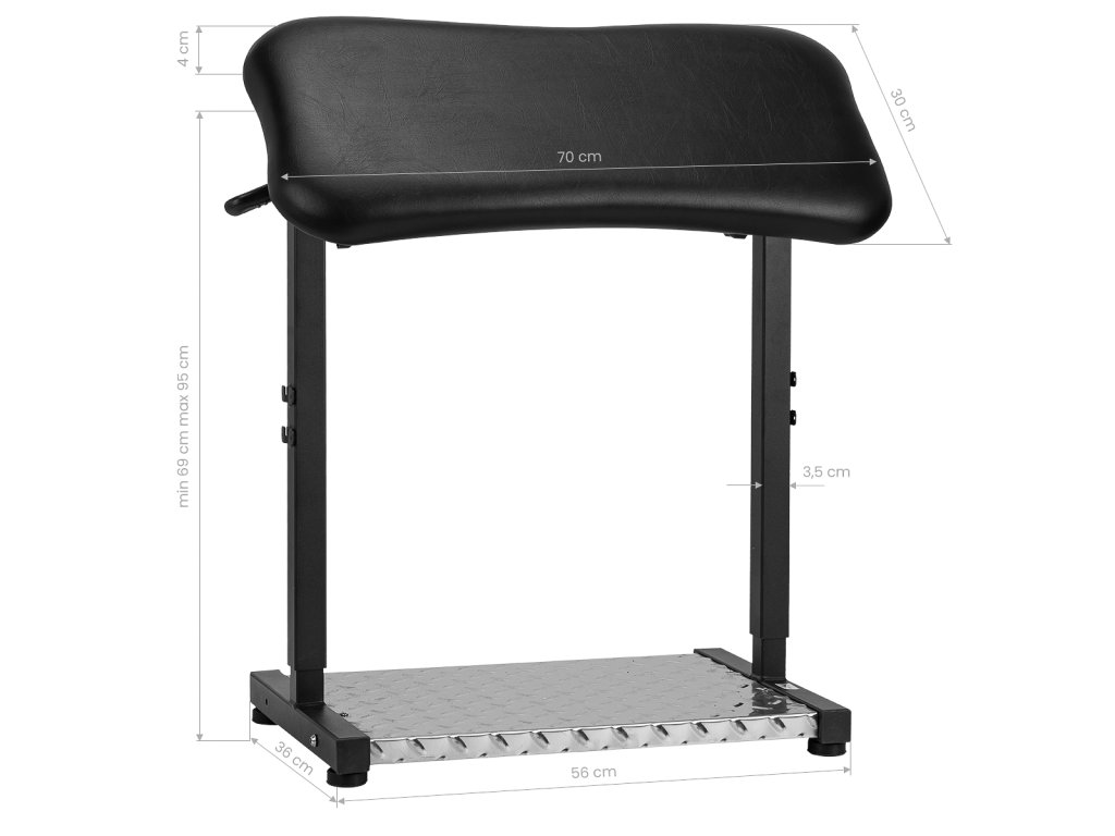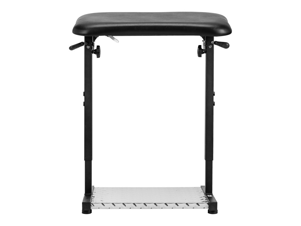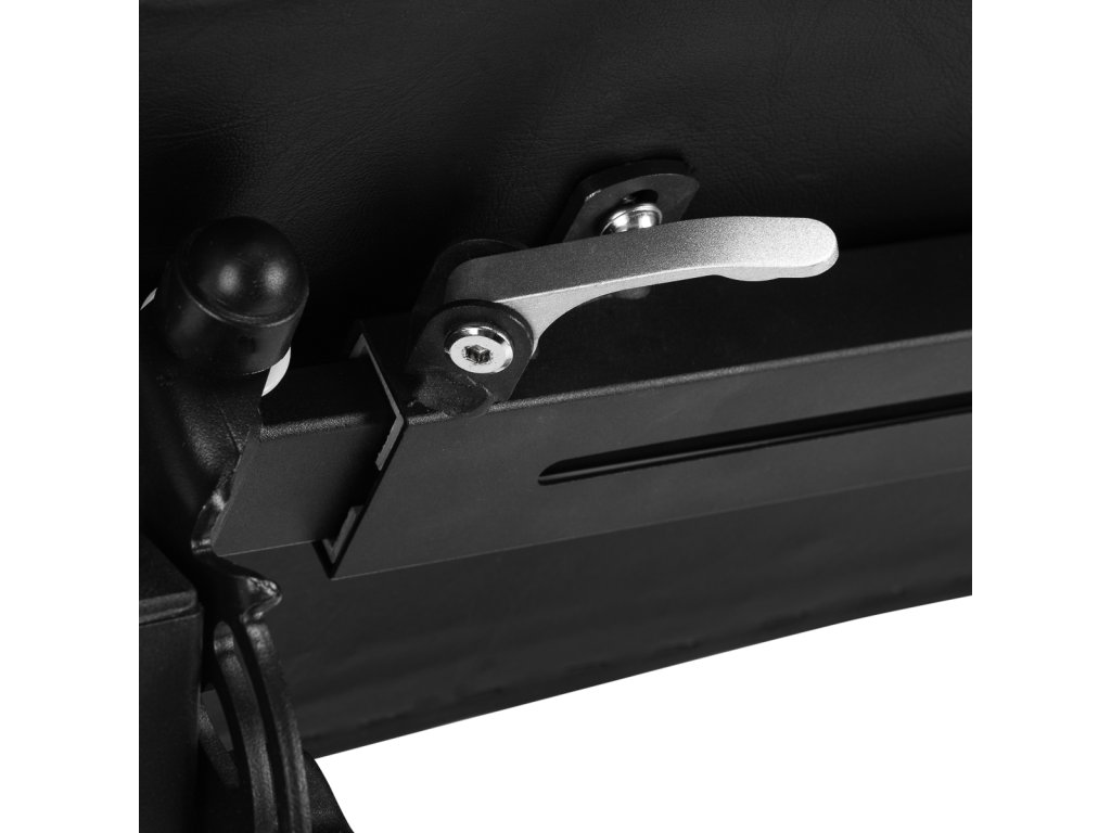 Výšku područky lze nastavit v rozmezí 69-95 cm, což umožňuje přizpůsobit ji potřebám klientů a zaručuje stabilní oporu během sezení. Nastavení sklonu područky až do 180° (90° na každou stranu), možnost nastavit výšku obou stran nezávisle díky zabudovaným plynovým zvedákům, umožňují optimální polohování opory. Široký rozsah nastavení výrazně zvyšuje ergonomii a pohodlí. Kovová opěrka nohou usnadňuje pohodlnou polohu pro tatéra nebo klienta. Možnost připevnit na rám zásobník na příslušenství a držák rukavic a ručníků navíc zvyšuje funkčnost tohoto modelu.