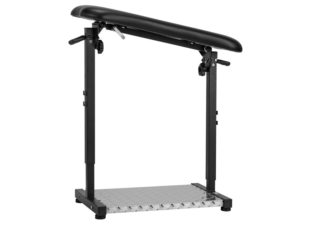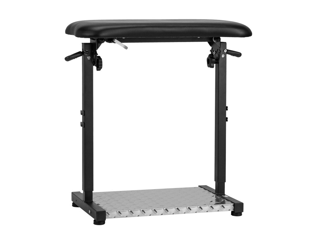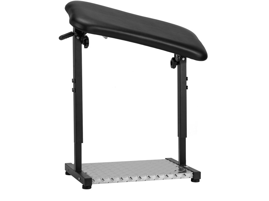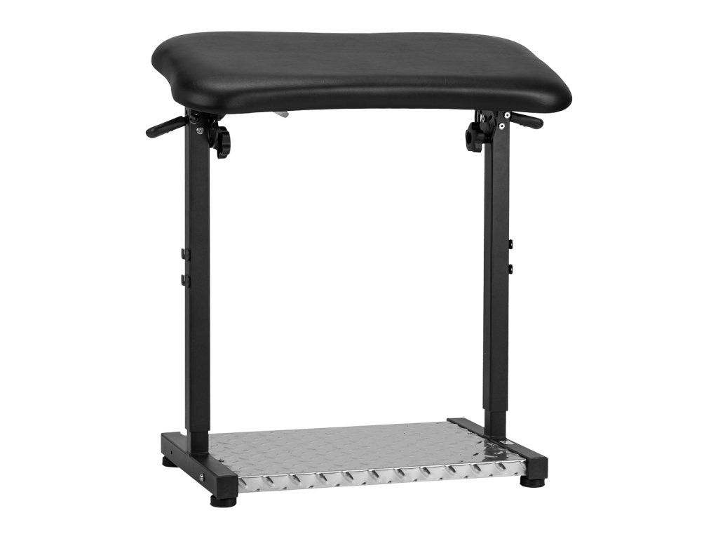 Výšku područky lze nastavit v rozmezí 69-95 cm, což umožňuje přizpůsobit ji potřebám klientů a zaručuje stabilní oporu během sezení. Nastavení sklonu područky až do 180° (90° na každou stranu), možnost nastavit výšku obou stran nezávisle díky zabudovaným plynovým zvedákům, umožňují optimální polohování opory. Široký rozsah nastavení výrazně zvyšuje ergonomii a pohodlí. Kovová opěrka nohou usnadňuje pohodlnou polohu pro tatéra nebo klienta. Možnost připevnit na rám zásobník na příslušenství a držák rukavic a ručníků navíc zvyšuje funkčnost tohoto modelu.