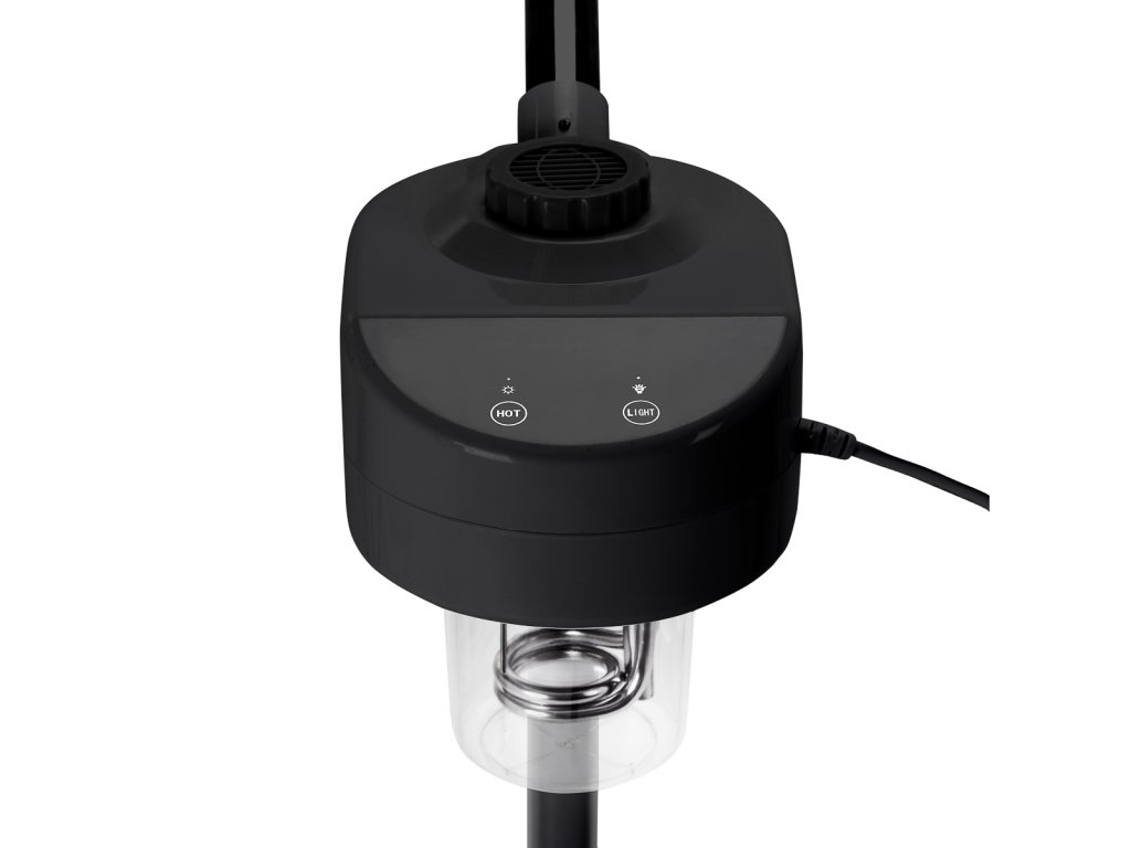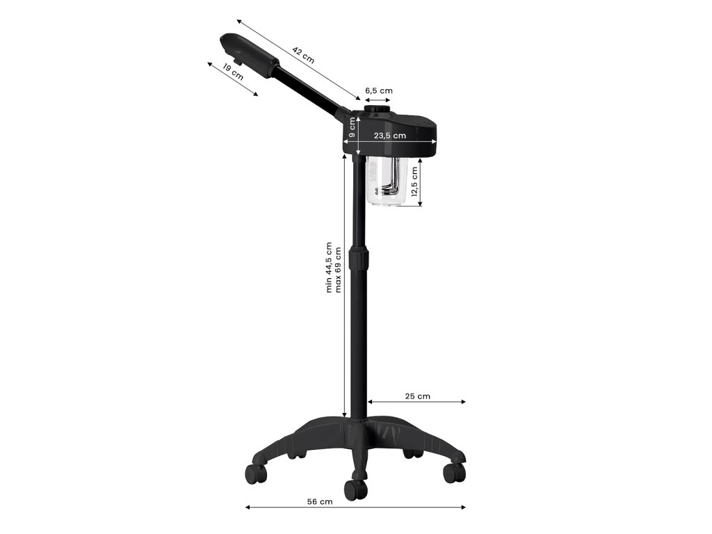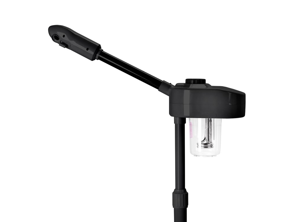 Otočná hlavice umožňuje přesné směrování proudu páry podle polohy klienta. Výškově nastavitelný stativ (44,5–69 cm) zaručuje komfortní práci a správnou ergonomii při různých procedurách.