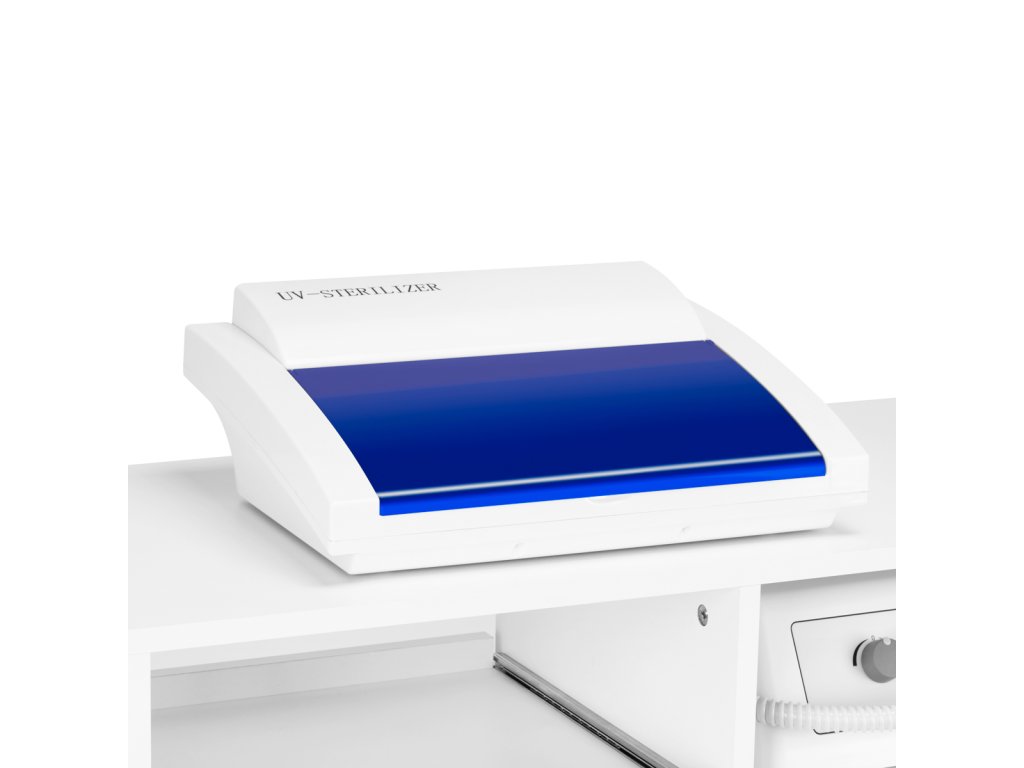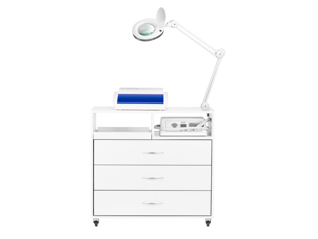 Byla vytvořena pevná podologická jednotka pro usnadnění práce osoby provádějící ošetření. Tři prostorné zásuvky pojmou veškeré potřebné příslušenství, nářadí a produkty. Významnou výhodou je výsuvná police , na kterou můžete umístit přístroje nezbytné pro práci podiatra , jako je sterilizátor nebo frézka. Bude také skvělým místem pro nádobí nebo přípravky, které stojí za to mít vždy po ruce. Nábytek je vybaven kolečky , která usnadňují práci a přemisťování. Umožňují snadnou přepravu mezi místnostmi. Držák TUBE umožňuje upevnit lampu přímo na desku stolu na libovolném místě. Pomocník je vyroben z odolných materiálů,snadno se čistí a výrazně zlepší výkon specializovaných služeb.