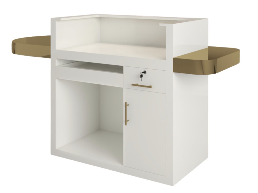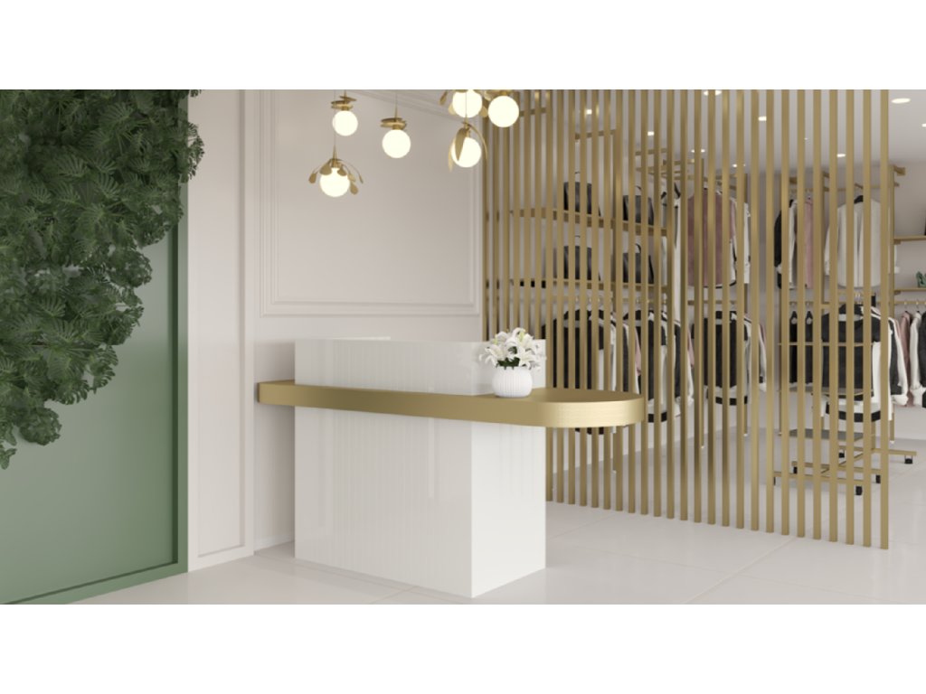 Recepce jek dispozici v matné bílé a matné krémové barvě - nástavec/pult v barvě starého zlata.