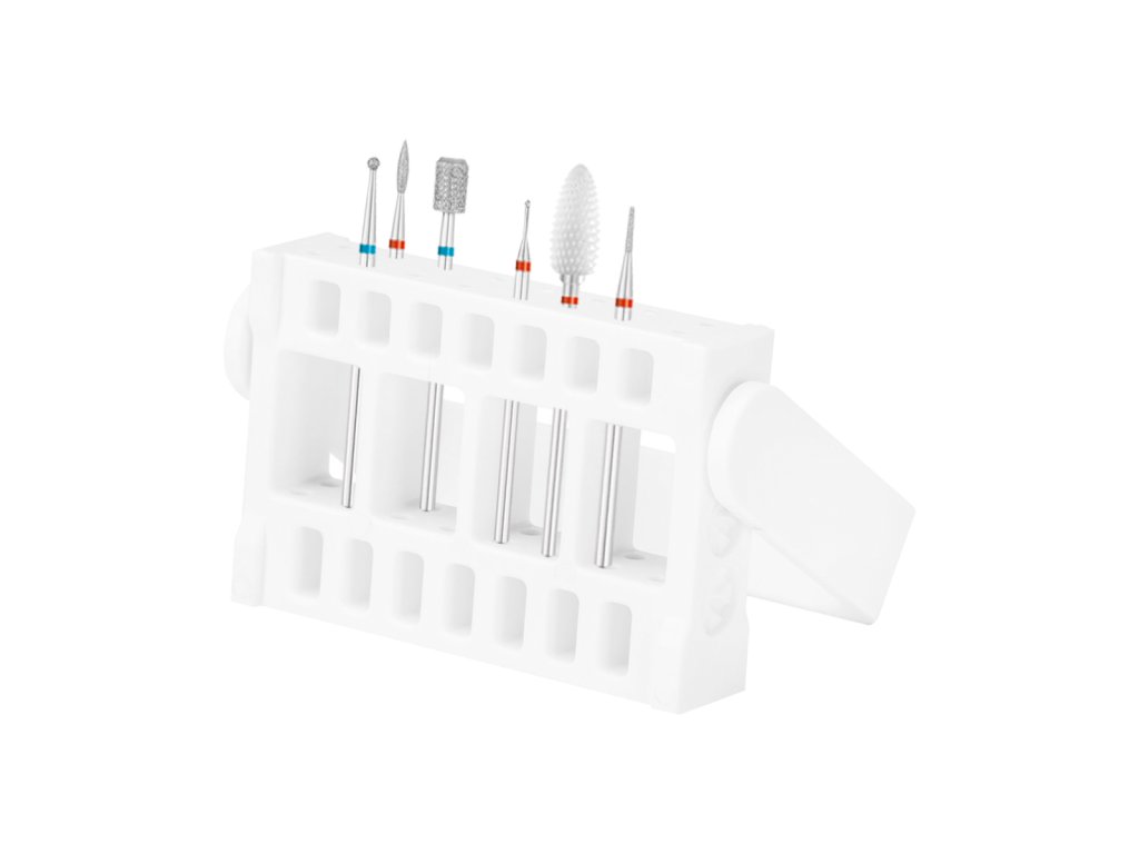 Praktický stojánek na frezy je vyroben ze speciálního materiálu, který umožňuje snadné a hygienické čištění, což je zásadní pro zachování vysokých hygienických standardů. Součástí balení jsou také nástroje určené k čištění hlavice a k demontáži frezů, které výrazně usnadňují údržbu zařízení a prodlužují jeho životnost.