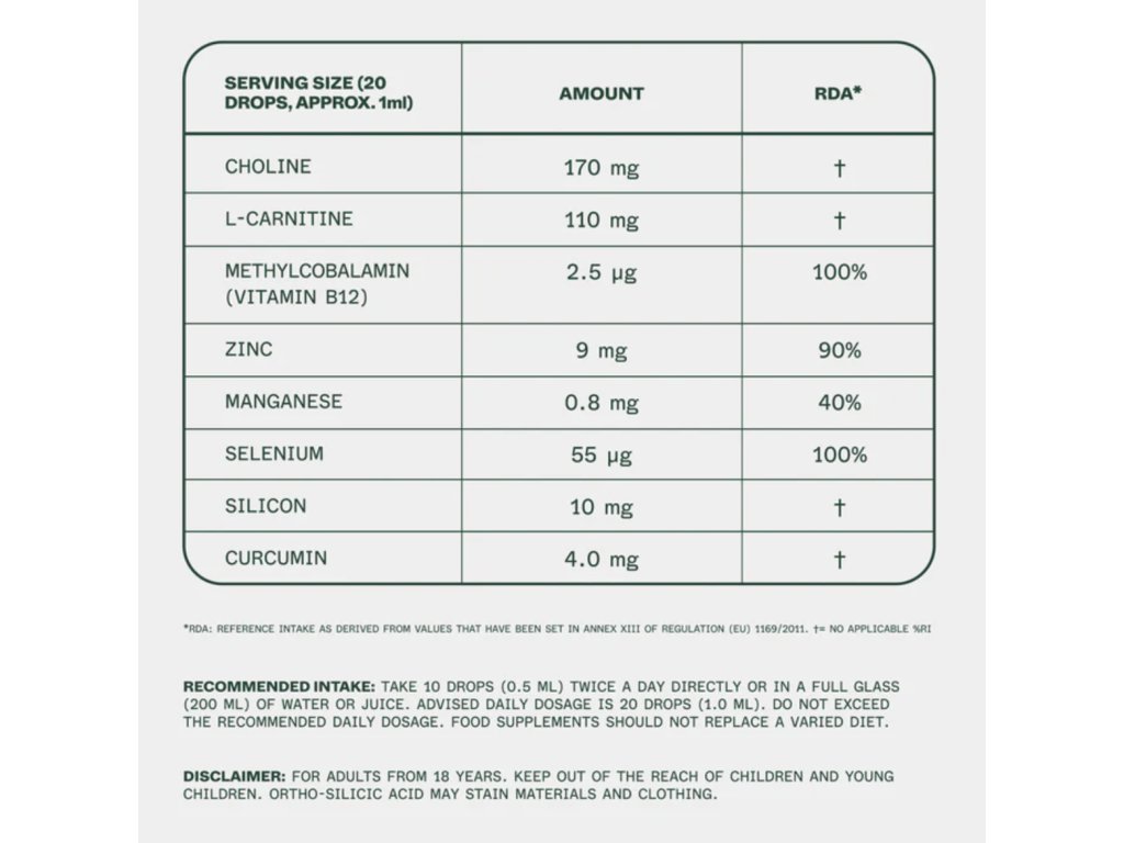 VODA (DEMINERALIZOVANÁ), CHOLIN CHLORID, L-KARNITIN HCL, KYSELINA ORTOKŘEMIČITÁ, CHLORID ZINEČNATÝ, REGULÁTOR KYSELOSTI (E508), KURKUMIN, CITRÁT MANGANATÝ, SELENAN SODNÝ, METHYLKOBALAMIN.