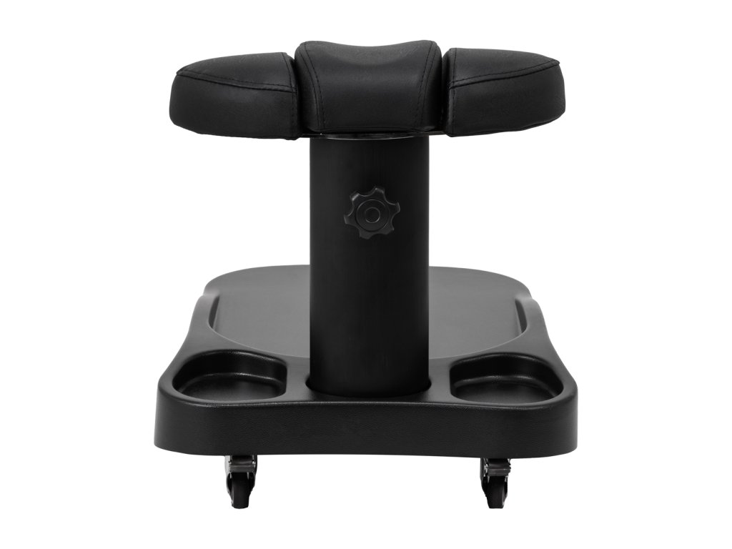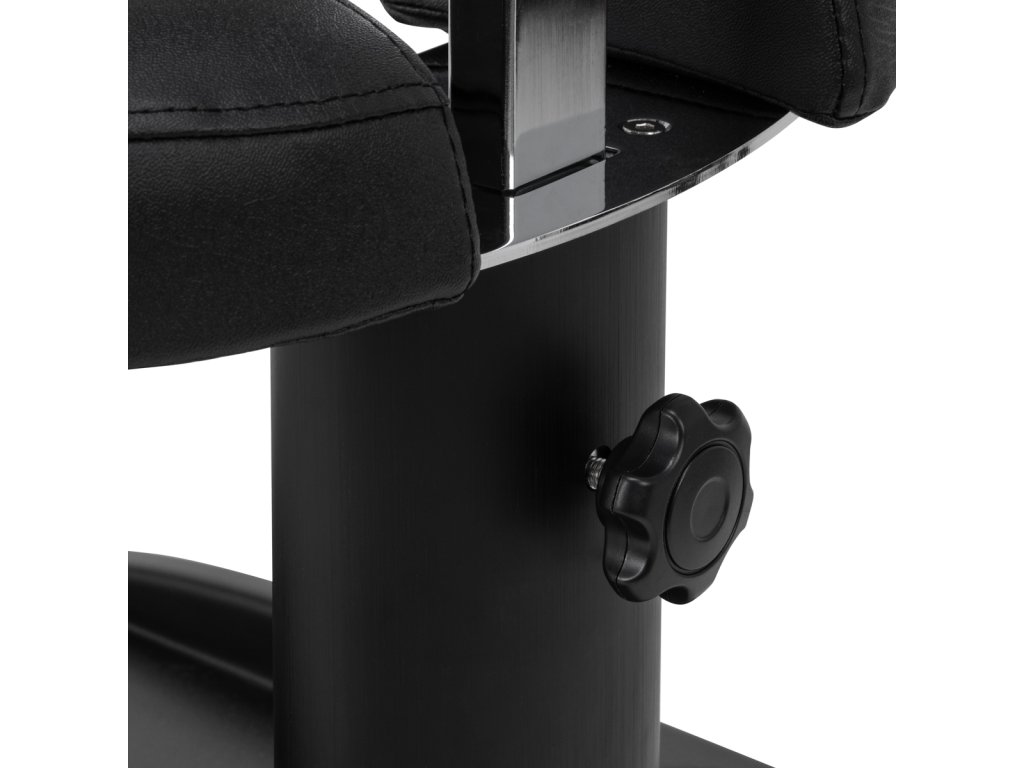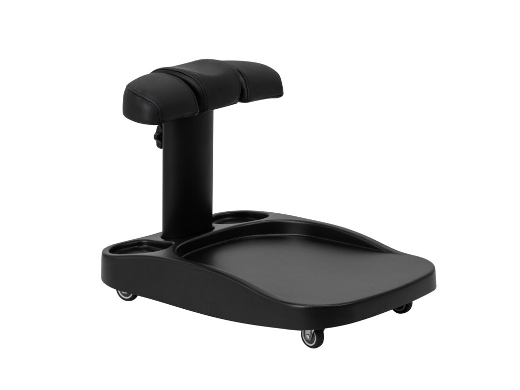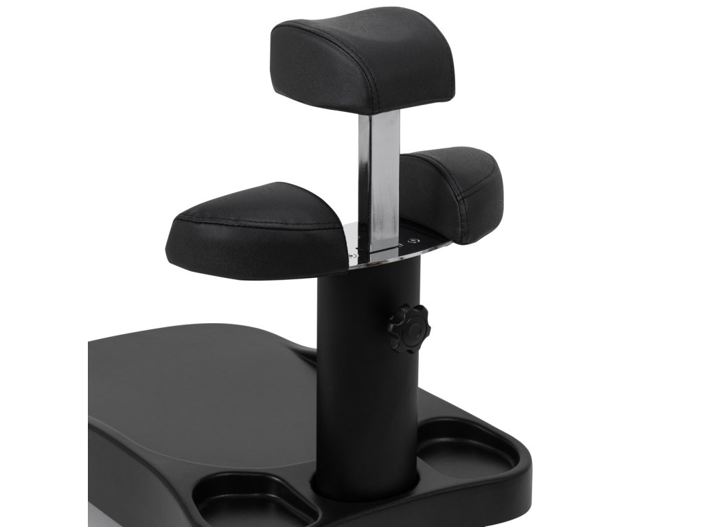 Opěrka nohou se skládá ze tří částí, prostřední je výsuvná. Ruční nastavení výšky umožňuje její zvednutí až o 20 cm. Všechny části podnožky jsou čalouněné syntetickou kůží, která zajišťuje odolnost proti vlhkosti a snadné čištění. Díky tomu lze vozík přizpůsobit individuálním potřebám uživatele, což z něj činí vynikající řešení pro kosmetické i podiatrické ošetření, které zajišťuje pohodlí a přesnost v různých polohách.