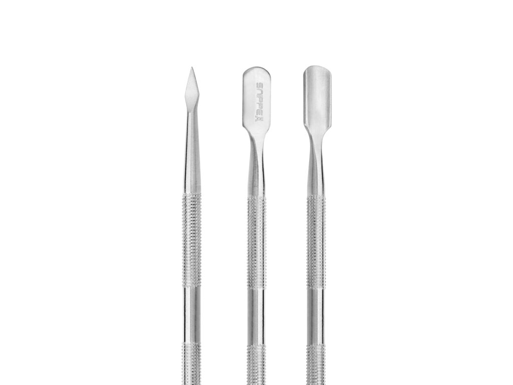 • Zaokrąglona łopatka przeznaczona jest do odsuwania skórek z płytki paznokcia, a także usuwania pozostałości poprzednich stylizacji. Specjalnie wyprofilowana końcówka jest oszlifowana w taki sposób, by nie uszkadzać płytki.