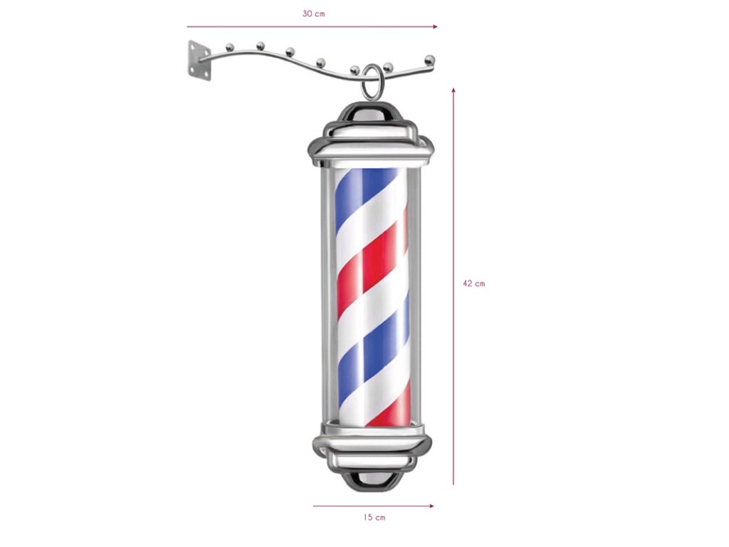 Světelná reklama BarberShop, osvětlená rotujícím válcem. Strop visící na háku, připevněný ke zdi.