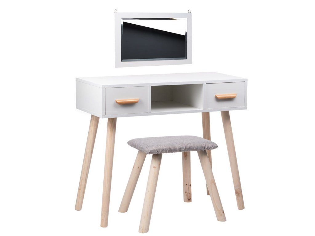 Wybrany model sprzedajemy jako OUTLET! w razie zainteresowania zapytaj o szczegóły!Ta wspaniała toaletka sprawi, że serca kobiet zabiją szybciej. Prosty, skandynawski kształt, dwie pojemne szufladki, wygodne lustro oraz półeczka pod blatem dopełniają całości. Od teraz maszwszystko pod ręką. Dzięki wygodnemu krzesełku, możesz wygodnie wykonywać codzienny makijaż.Cechy produktu: Toaletka w prostej stylistyce w kolorze białym Dwie szufladki Półka pod blatem (schowek) Kwadratowe lustro do powieszenia na ścianie Krzesełko pokryte brązowym zdejmowanym pokrowcem Wysoka funkcjonalność. Wymiary:-Szerokość blatu 85cm, -Głębokość blatu 40cm, -Wysokość blatu 77,5cm, -Wymiary lustra: 52x37cm, -Wysokość całkowita 117,5cm, -Wymiary wewnętrzne szuflad: szer: 20cm, dł: 35cm, gł: 12,5cm, -Wymiary wnęki pod blatem: szer: 31,5cm, dł: 38,5cm, wys: 14cm, -Wymiar krzesełka wys 41cm, szer: 39cm, gł: 30cm, -Wymiary opakowania 99x49x34cm,Waga 26kg, Wykonanie - MDFToaletkę wysyłamy jako komplet do samodzielnego montażuGwarancja 12miesięcy.