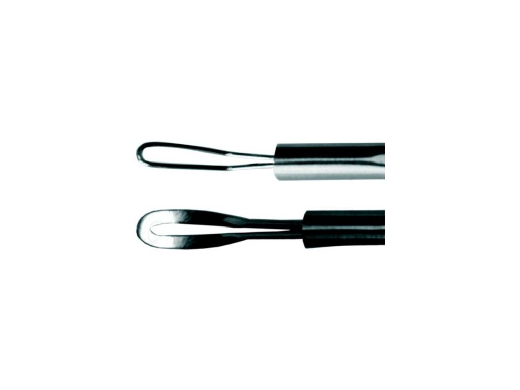 Tyčinka pro mechanické čištění pleti od otevřených a uzavřených černých teček. Funguje skvěle na těžko přístupných místech (nos, ucho). Nástroj je vyroben z chirurgické nerezové oceli se dvěma průměry smyčky.