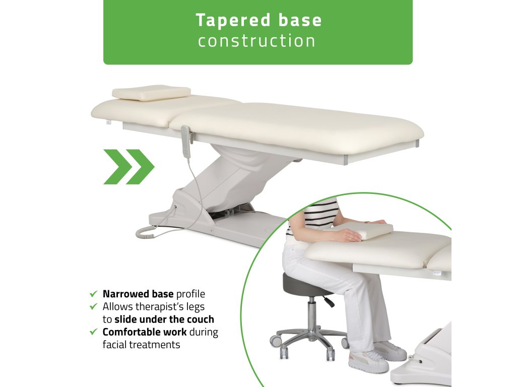 Zúžená konstrukce základny – lepší přístup ke klientovi z horní části lehátka, prostor pro nohy terapeuta