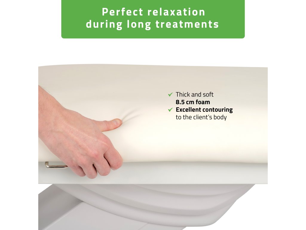 Pohodlné polstrování o tloušťce 8,5 cm – dokonale se přizpůsobí tělu klienta i při delších sezeních