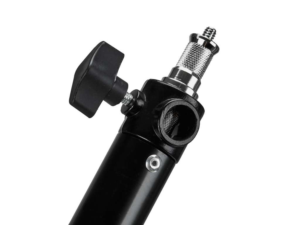 Teleskopowa konstrukcja daje możliwość dostosowania długości ramienia w zakresie od 73 do 131 cm. Regulacja kąta ułożenia statywu zapewnia znaczną swobodę ruchu w pionie i poziomie, umożliwiając precyzyjne skierowanie oświetlenia w wybranym kierunku. Dwustronny trzpień montuje się w jednym z trzech otworów, co pozwala dobrać odpowiednie ustawienie oświetlenia do własnych potrzeb.