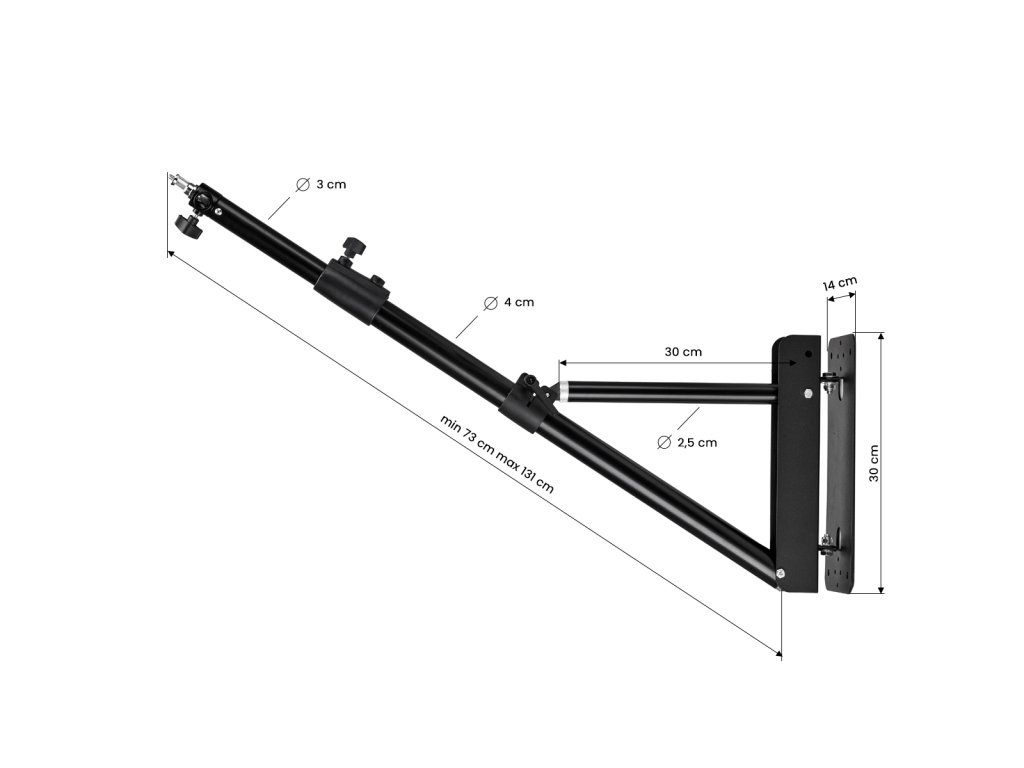 Regulowanej długości, stalowy uchwyt ścienny przeznaczony jest do lamp i ringów świetlnych z gwintami o średnicach 6 mm i 9 mm. Solidny wieszak pozwala dokładnie rozplanować oświetlenie i stabilnie umocować je nad stanowiskiem pracy.